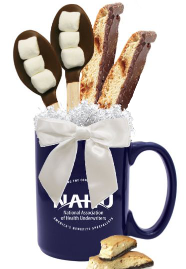 Who can say no to cookies and cocoa?! Add some sweetness to your client’s day with this mug filled with cocoa, marshmallows, and biscotti cookies. Whether they are sitting by a campfire or wrapped up in that plaid blanket from above, this is a tasty addition that anyone will love!